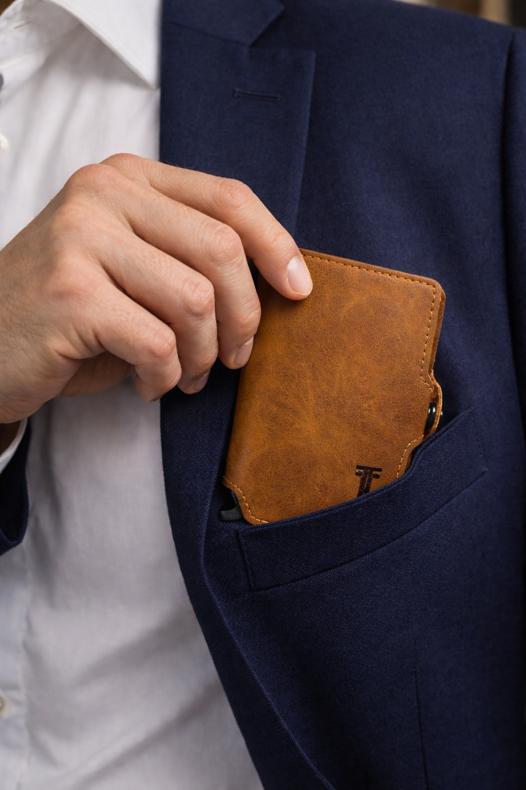 Máxima resistencia : Fabricada en aluminio y aleación de titanio, combinada con cuero natural 100%, protege tus tarjetas de dobleces, rayas o roturas. 🛡️